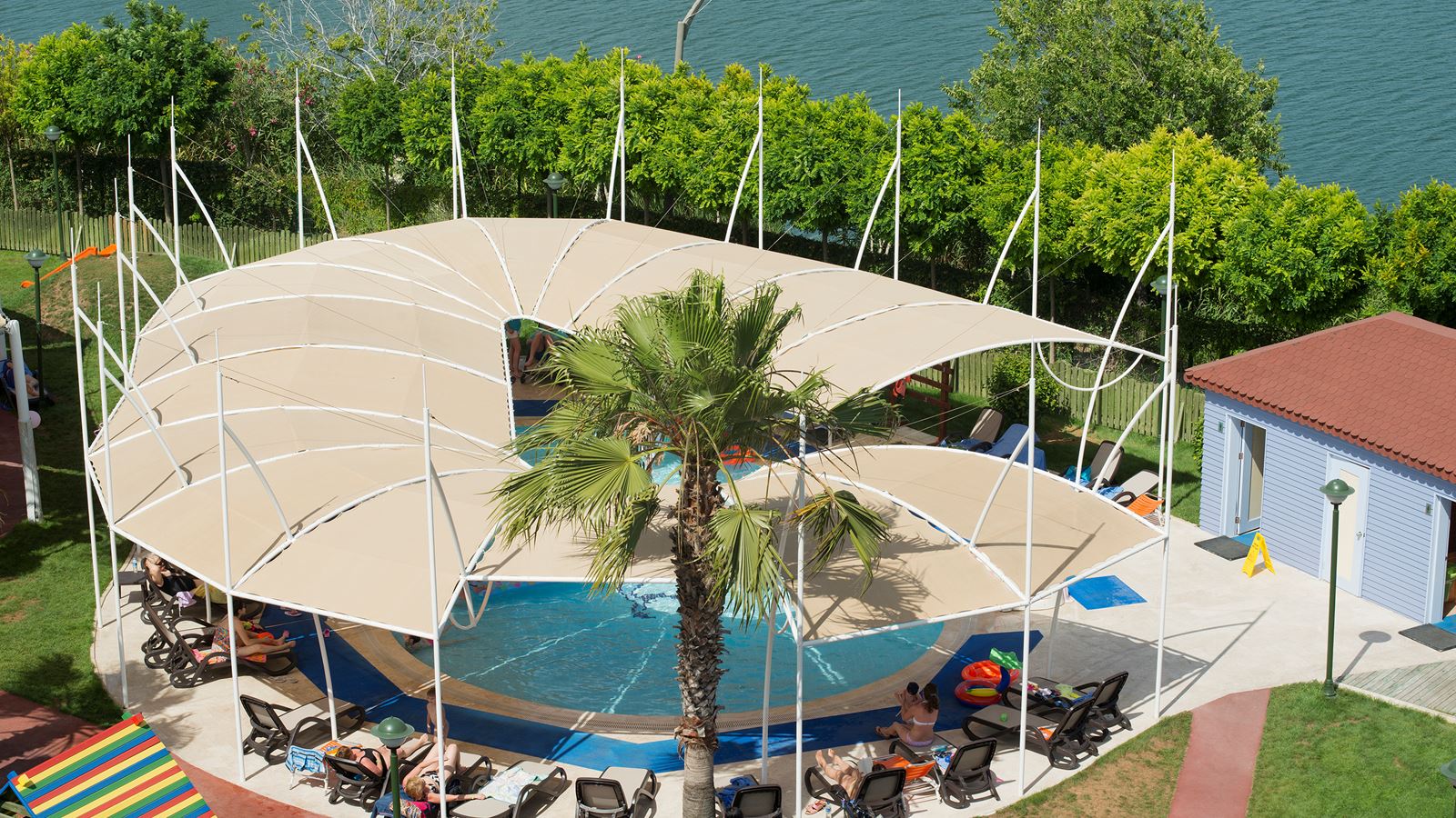 Basseinid täiskasvanutele: 4 | Välibassein (suurus 448 m2, sügavus 140 cm) Välibassein (suurus 450 m2, sügavus 140 cm) Välibassein (suurus 302 m2, sügavus 140 cm) Sisebassein (Soojendatud, suurus 108 m2, sügavus 140 cm) |